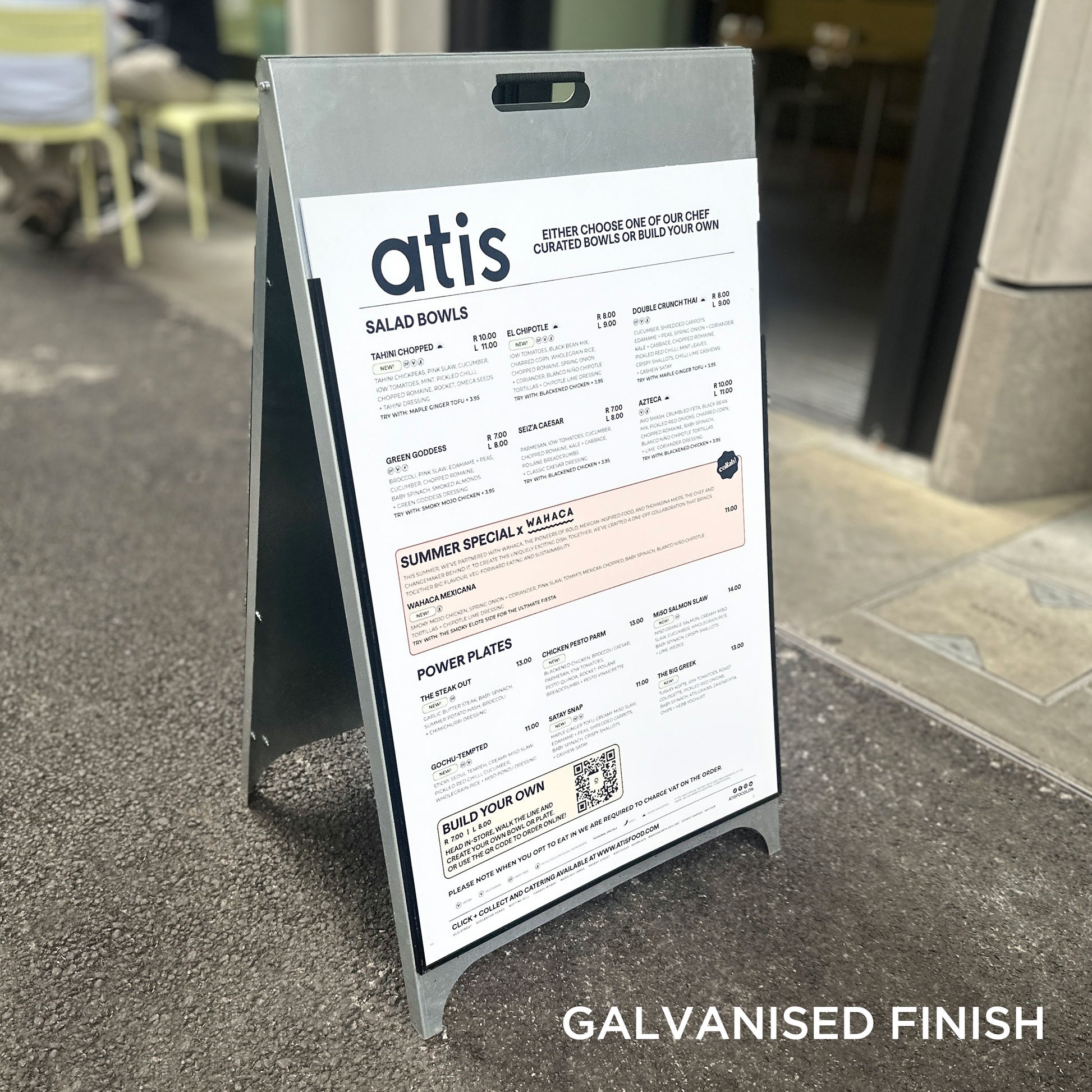 This is our changeable 'A' board sign, simply slide in printed panels slide from the top. Hand crafted and finished in our London workshop. Great for shops, pubs, cinemas, florists, cafés, bars and restaurants.