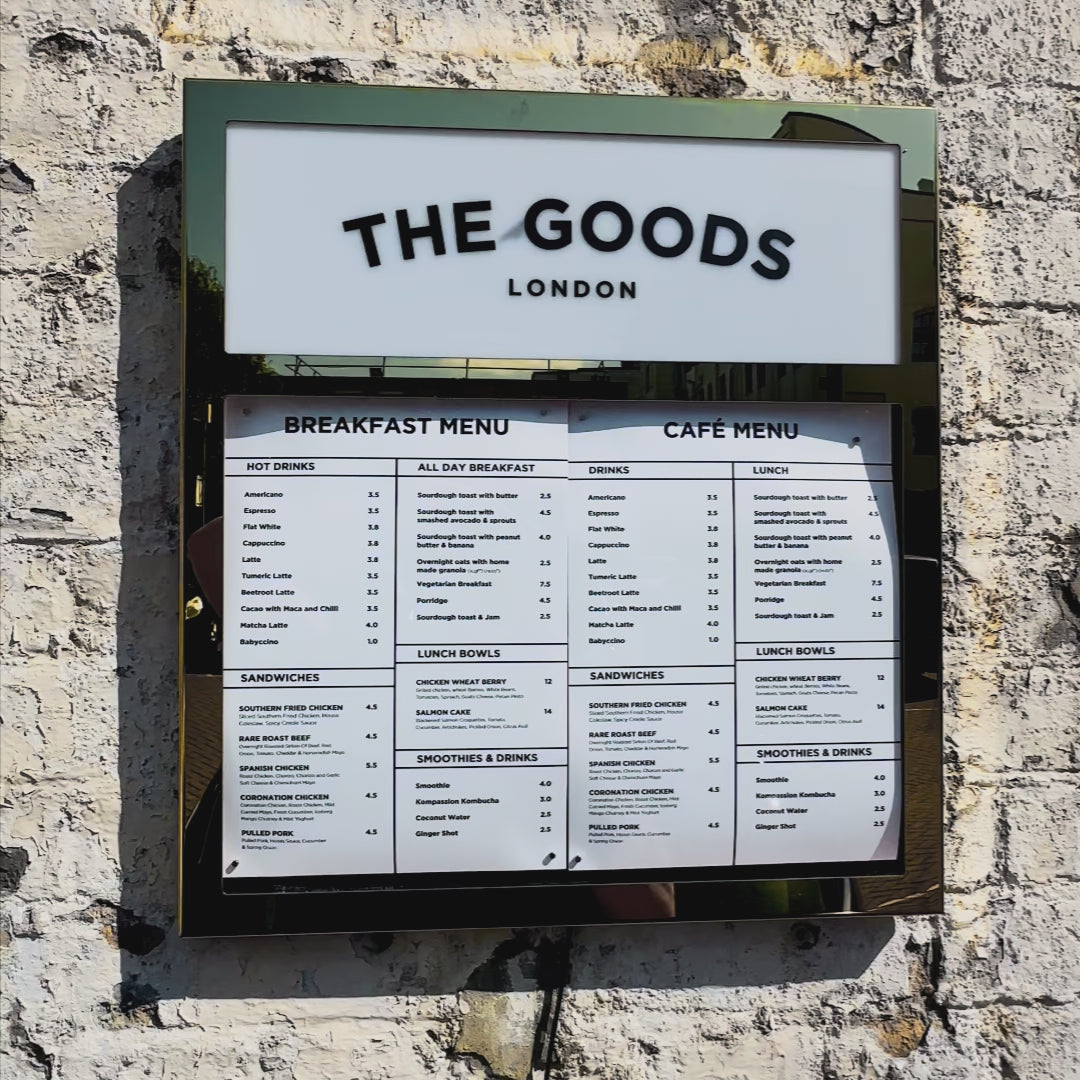 Our personalised brass effect (polished gold stainelss steel) menu cases are great for cafés, coffee shops, bars, restaurants and hotels. Fitted with an easily removable front panel, no fiddly locks here. The branded panel is illuminated so you can add your design or logo.